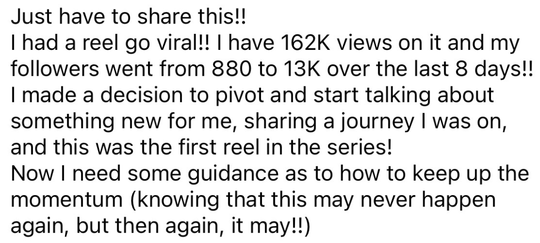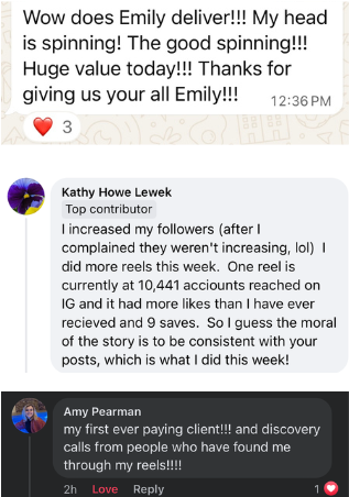 - Private Facebook Group for Q&A + feedback to help with content creation & business growth